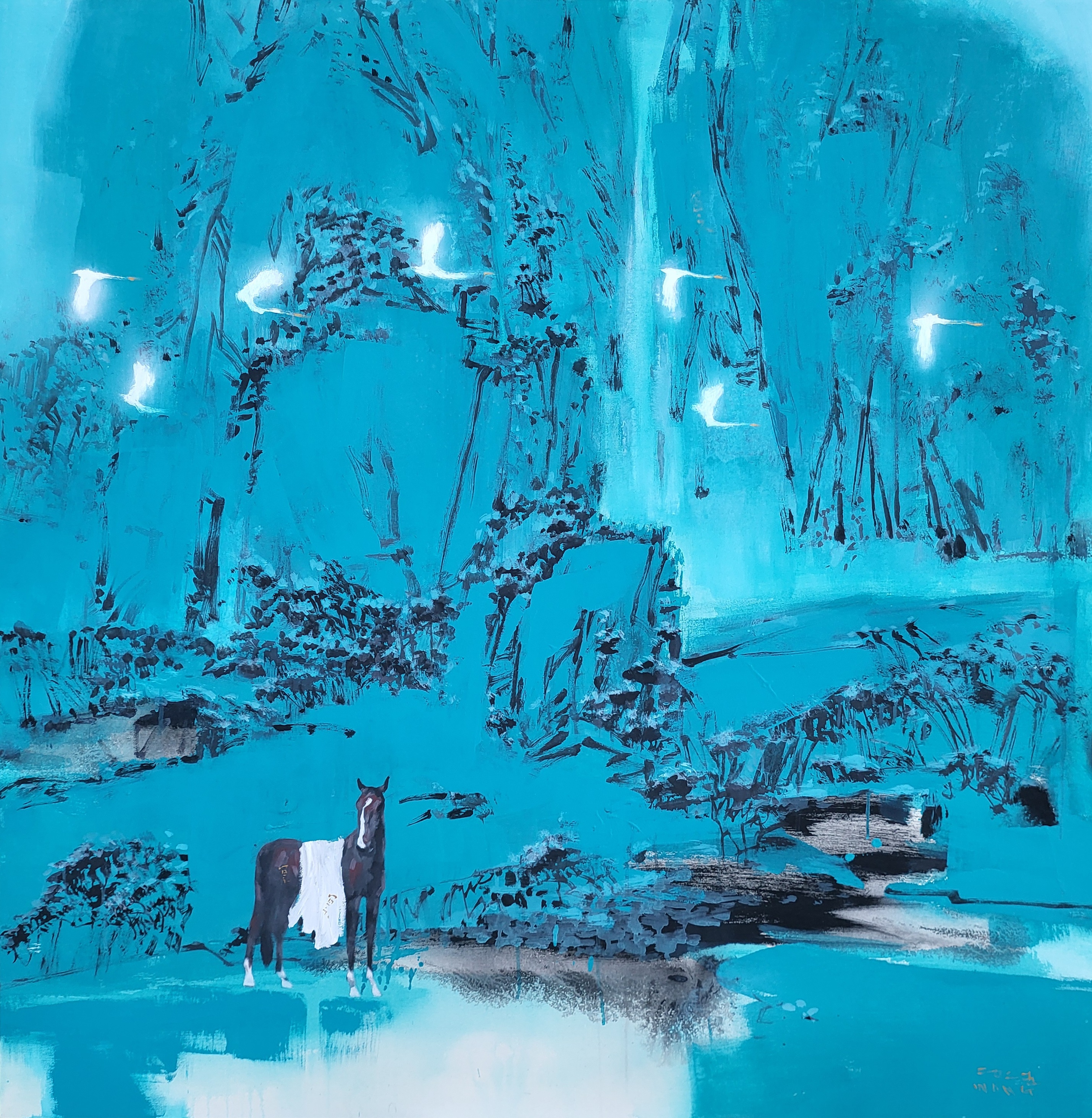 그리고 ‘말’은 아버지의 은유입니다. 가장의 모습이지요. 제 그림 속 말은 결코 달리지 않습니다. 명상하듯 고요히 서 있죠. 그 의미는 한 가족의 무게를 짊어지고, 하루의 노동을 마치고 돌아와 흰 수건을 두른 채 앉아 잠시 숨을 고르는 우리네 모든 가족들의 가장을 표현합니다.