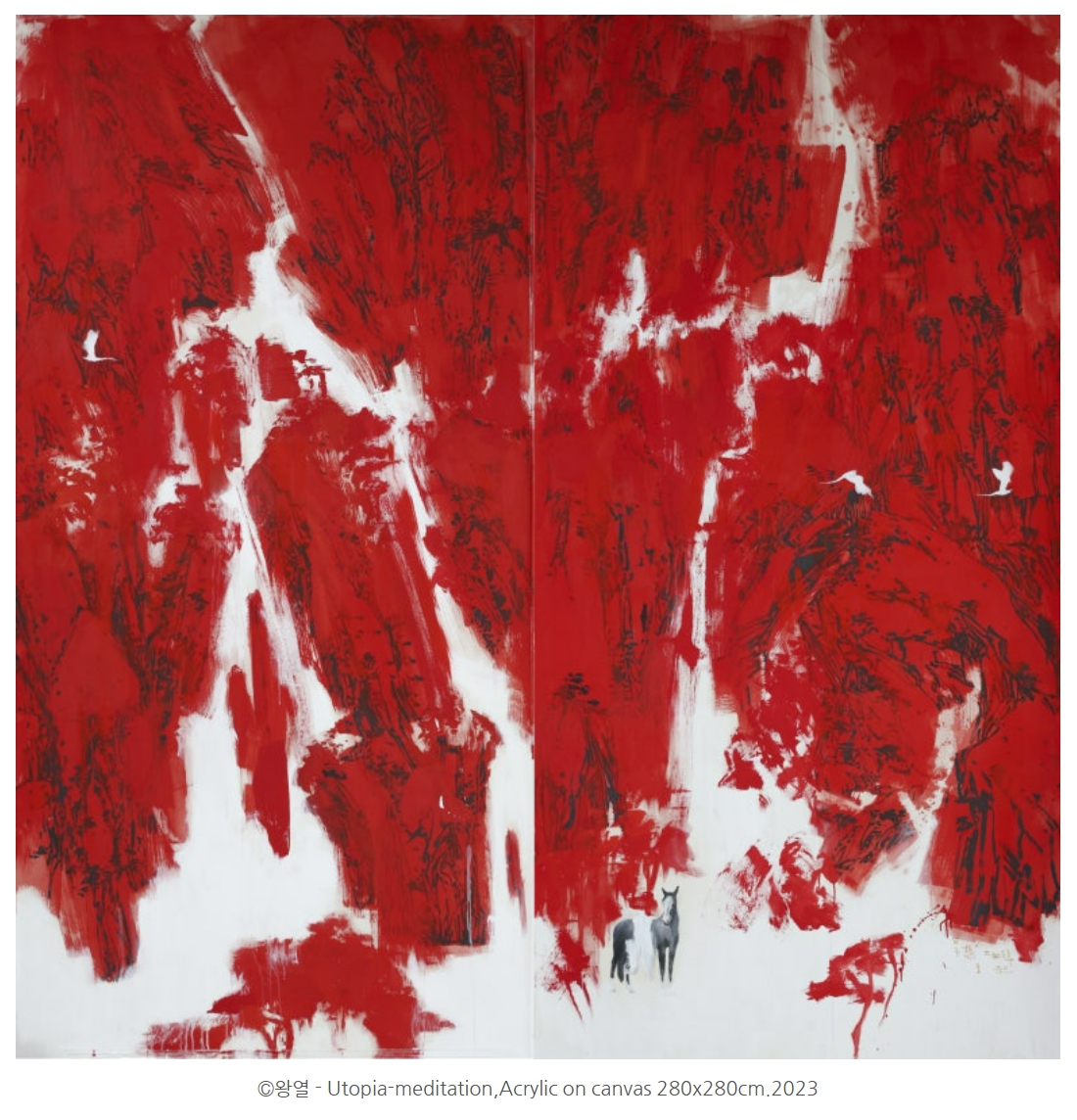 왕열 화백 : 네, 적색은 인간사의 격정과 고양된 감정을, 청색은 내면의 침잠과 사유를 드러냅니다. 우리의 마음은 이 두 색 사이를 오가며 진동을 하고 있지요.