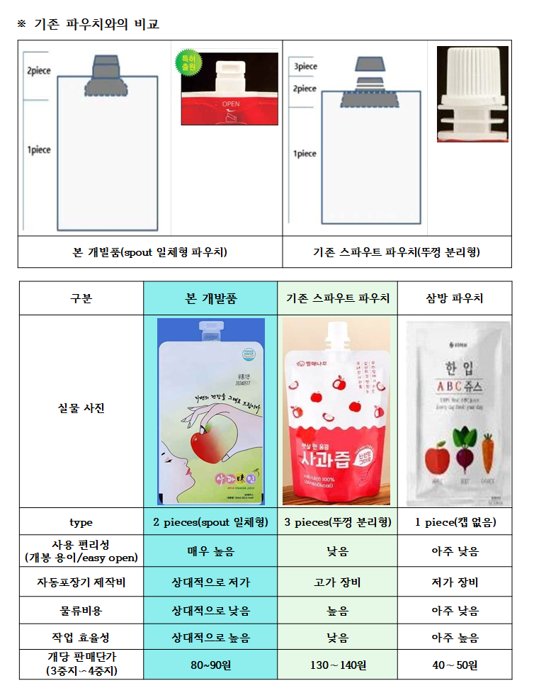 기존 파우치 종류들이 가진 위생성·공기 접촉·단가 문제를 극복했으며, 물류 효율까지 극대화한 세계 최초의 일체형 2피스 구조이다.